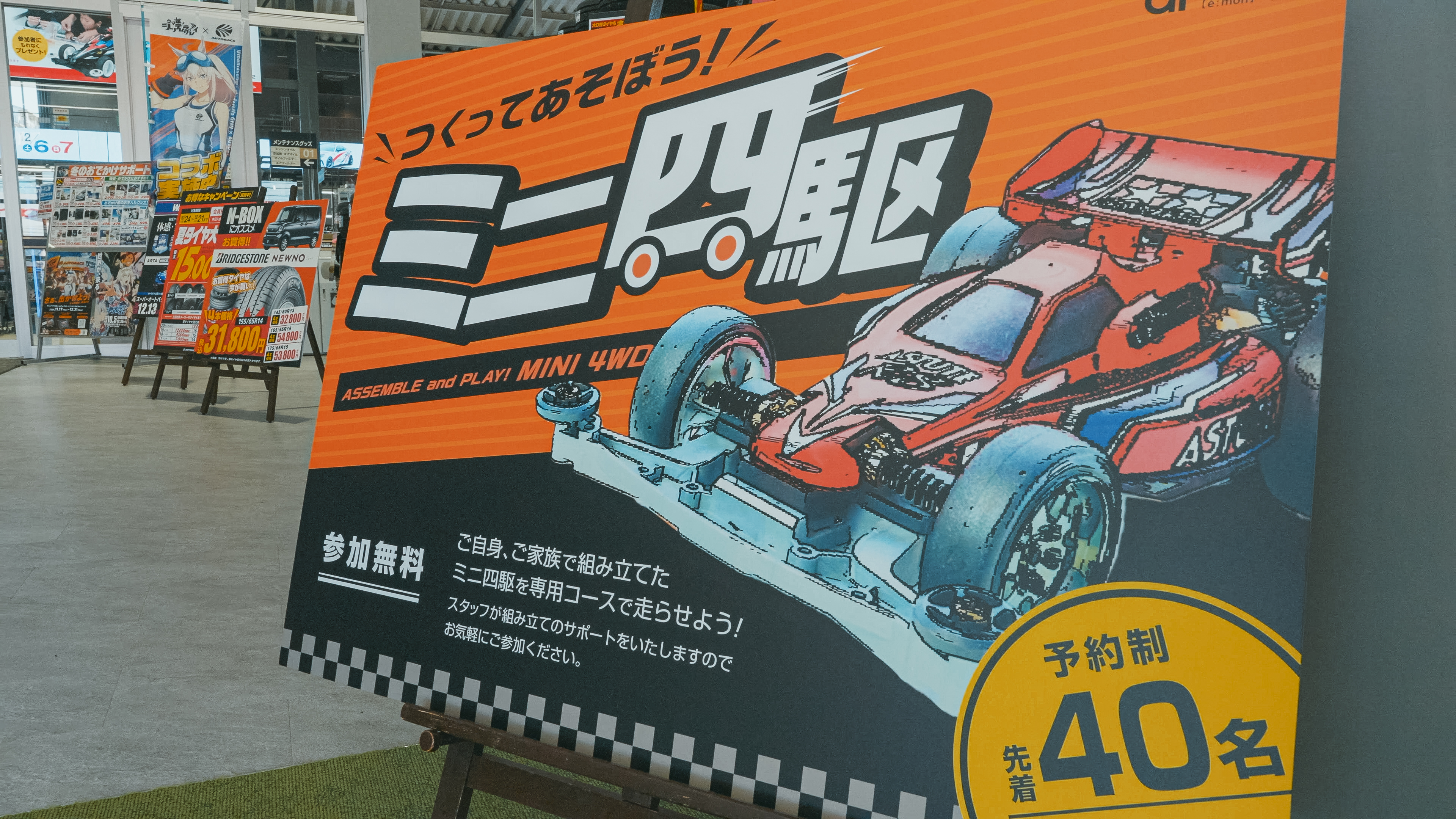 予約制・参加無料で、組み立てたミニ四駆はそのままプレゼント。