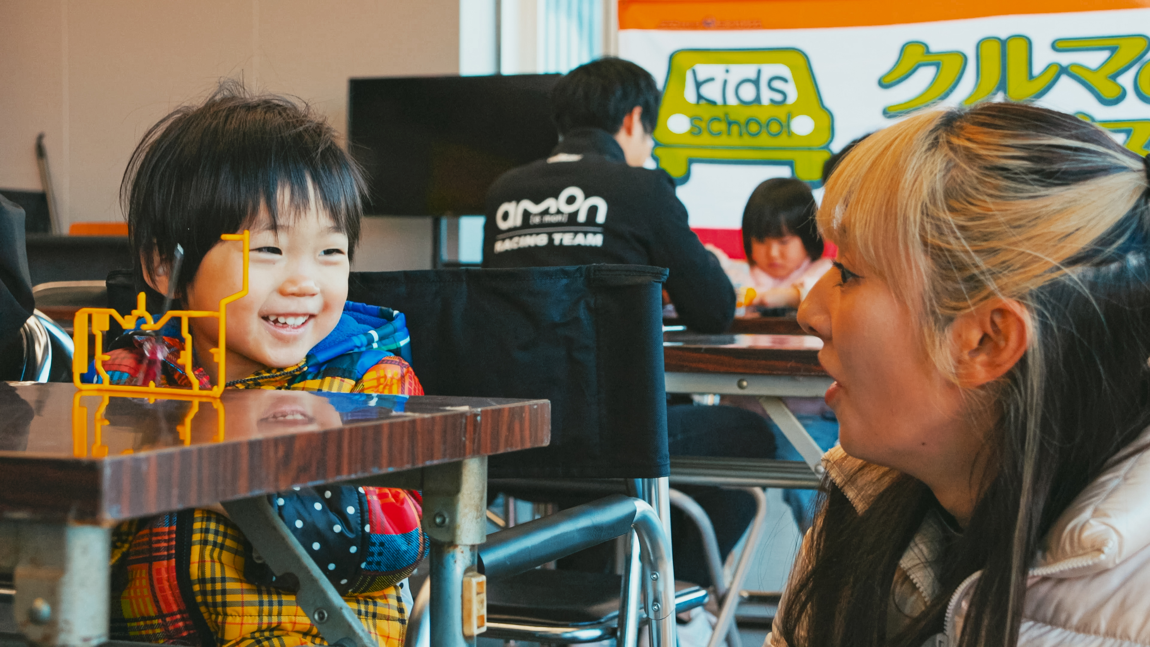 お父さん・お母さんと一緒に説明書を見ながら、ネジを締め、タイヤを取り付け、完成したマシンが走る瞬間には自然と笑顔がこぼれます。