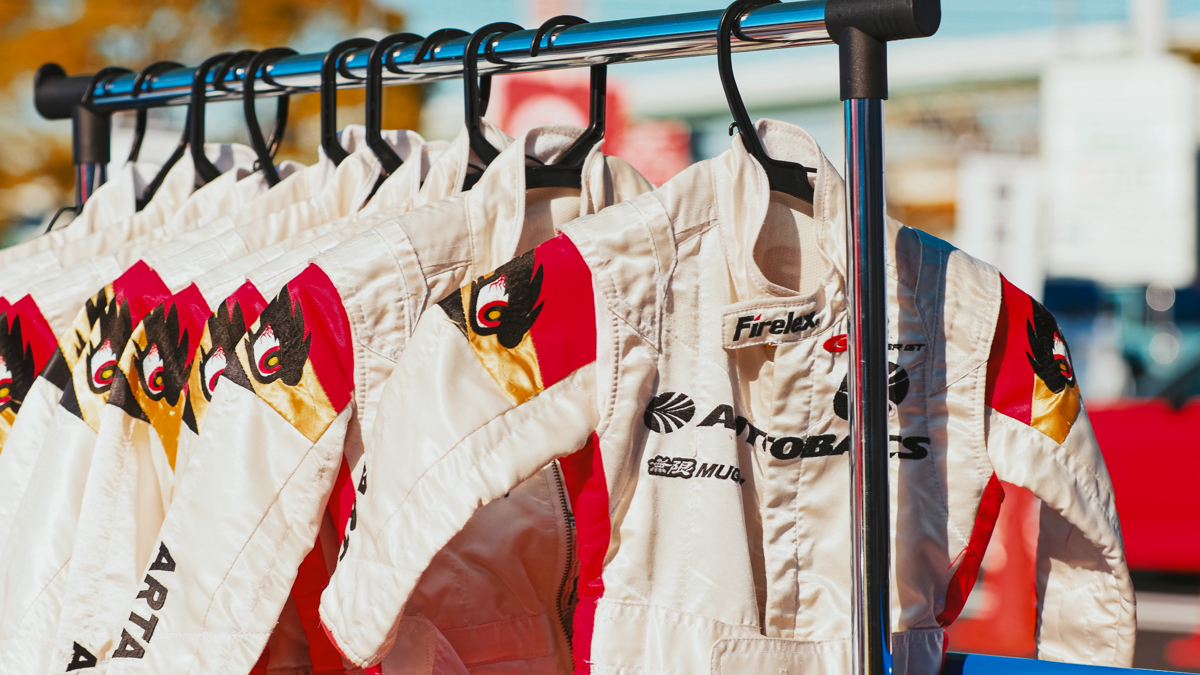 レーシングスーツを着て、カッコいいクルマと一緒に写真撮影。