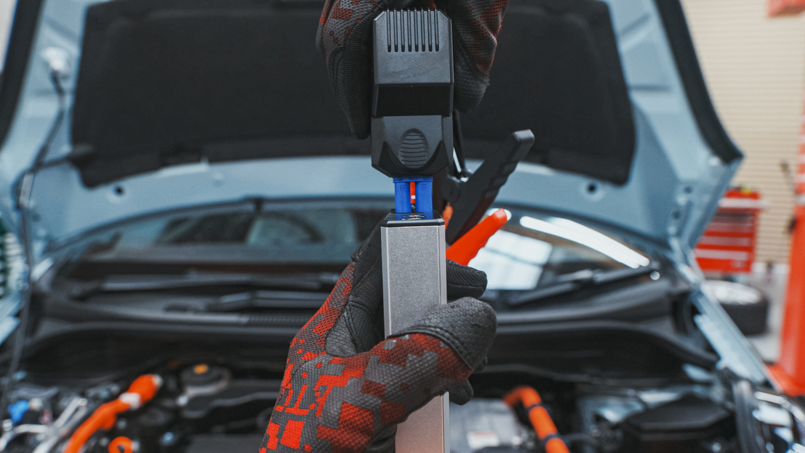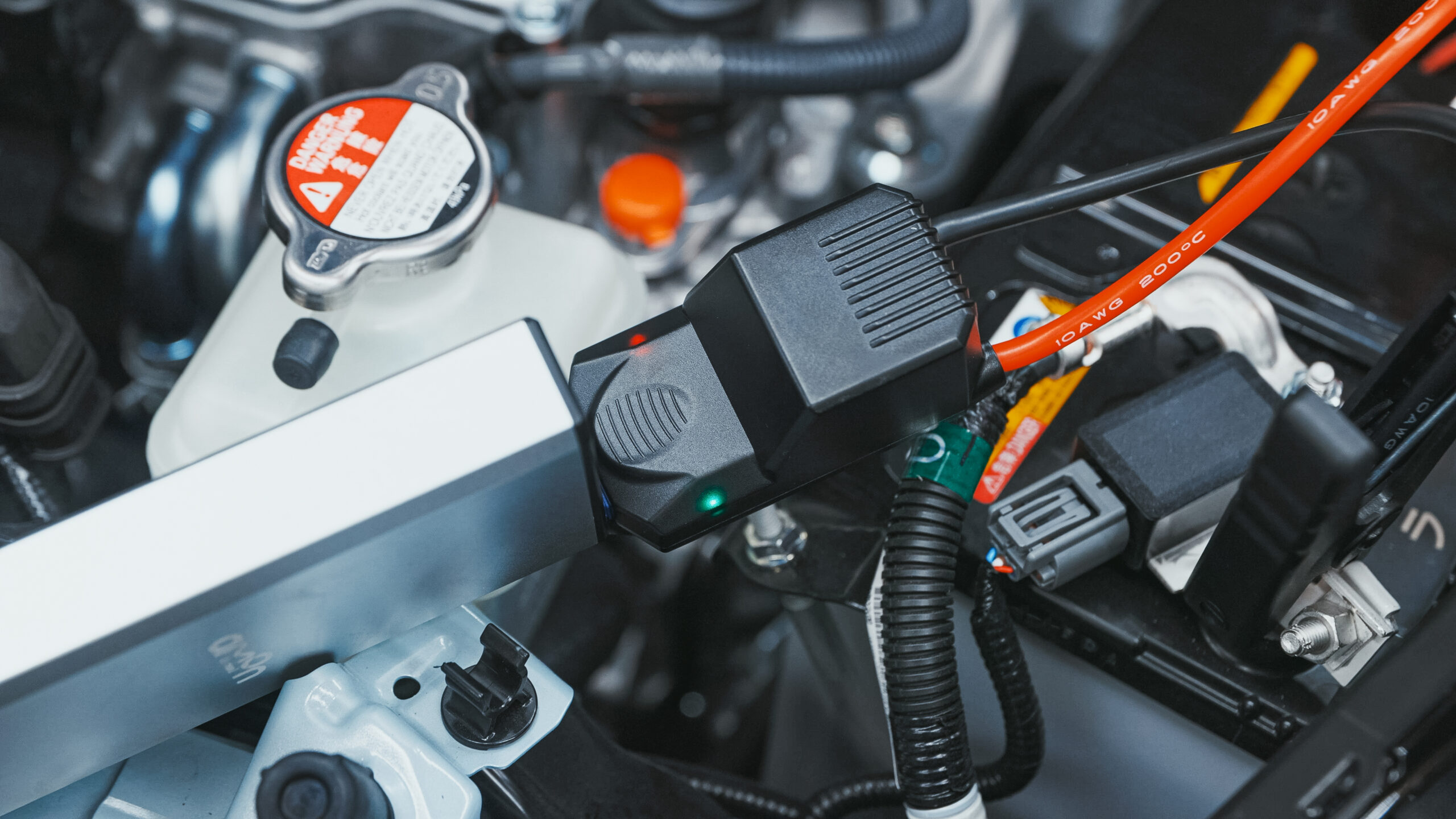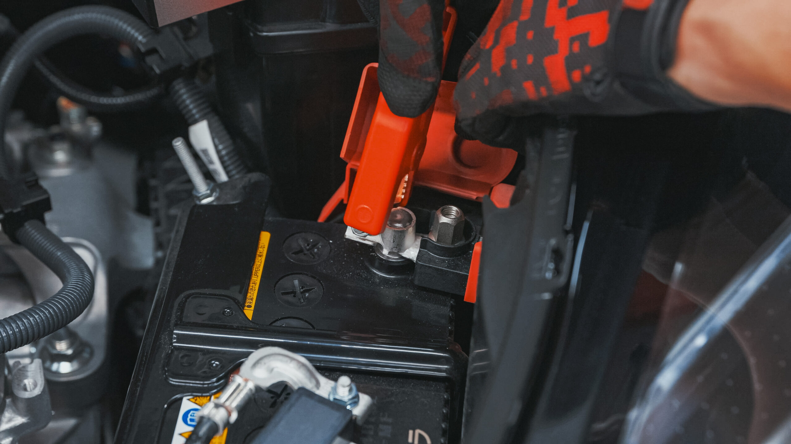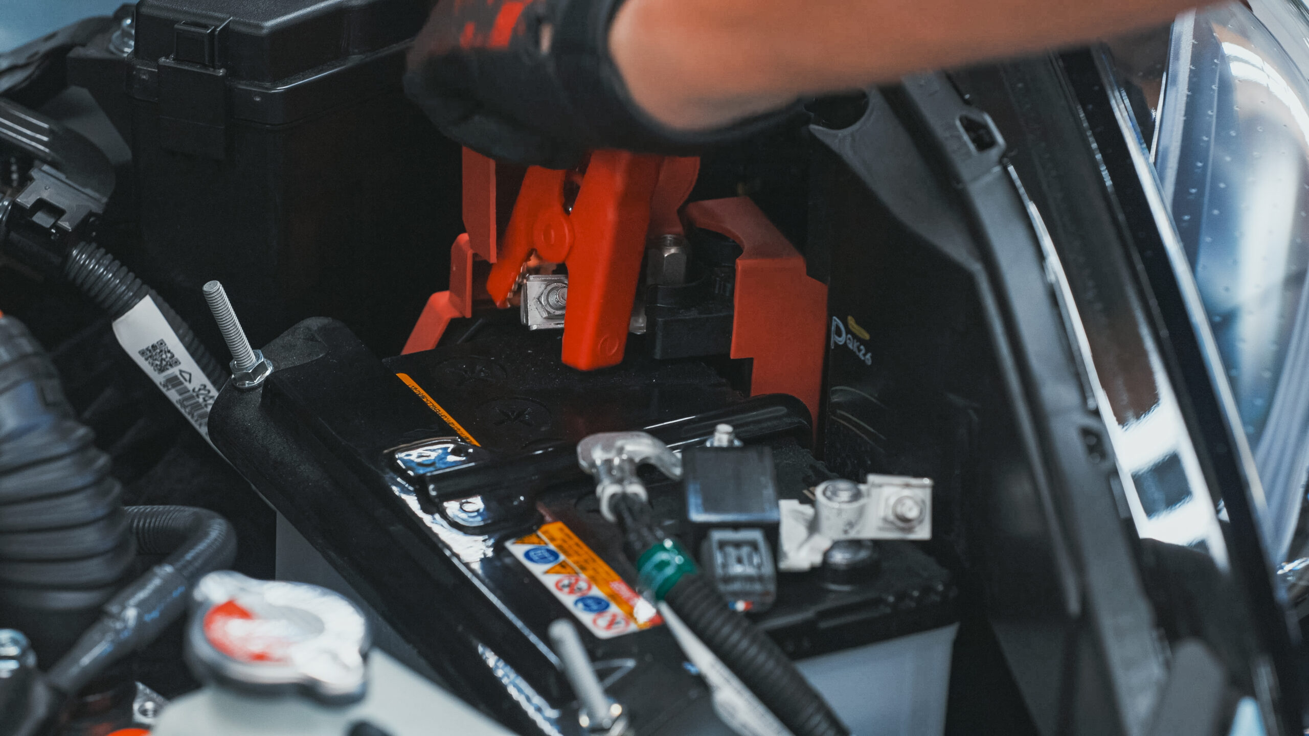 赤のクリップをバッテリーのプラスターミナルに、黒のクリップをマイナスターミナルに接続します。