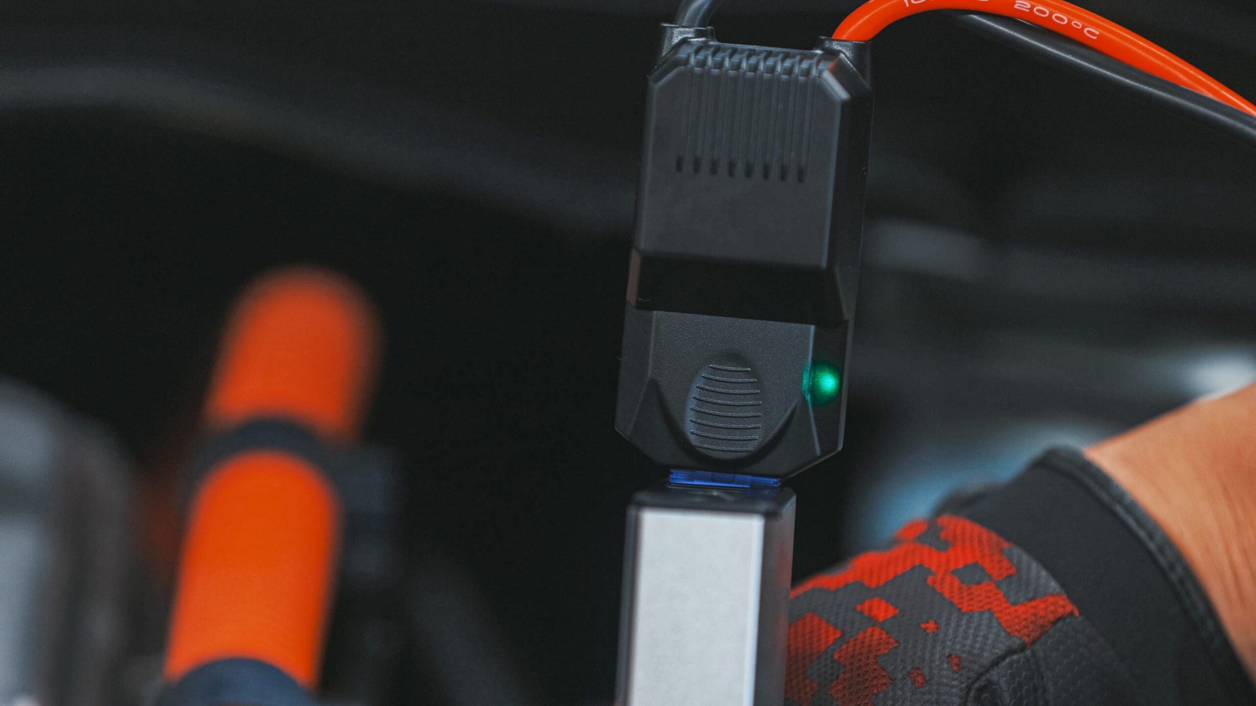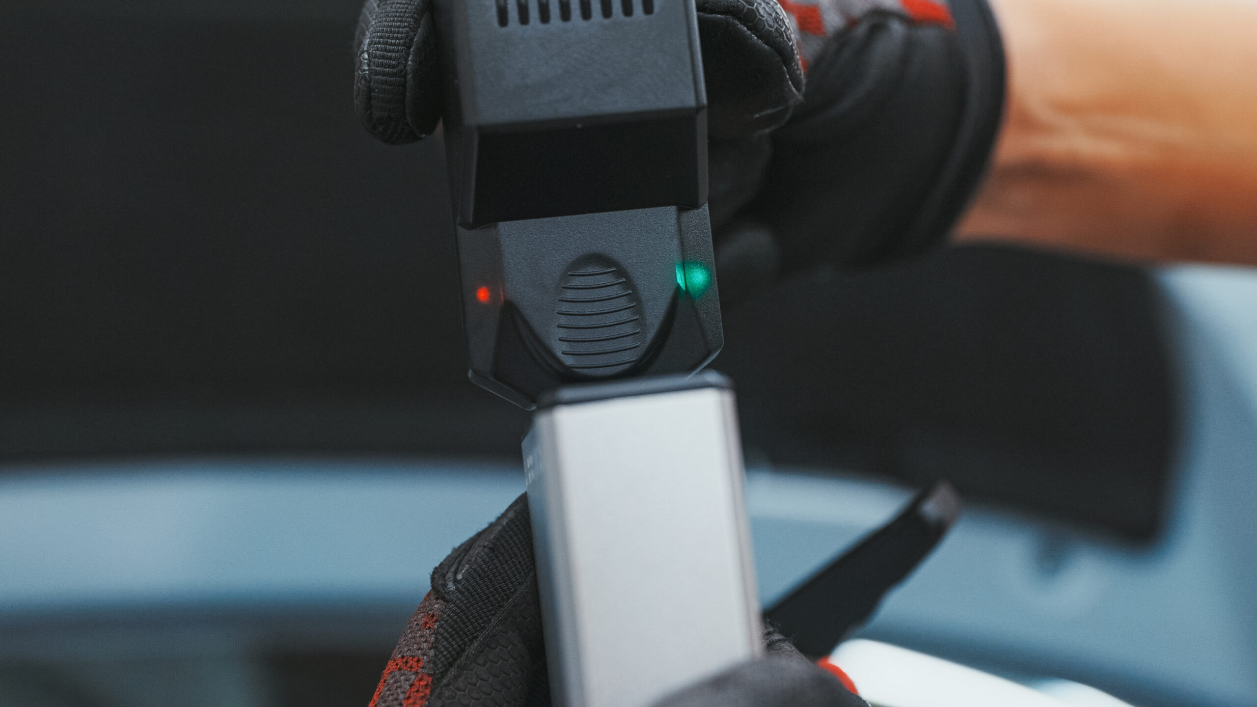 本体とクリップコードを接続時、緑と赤のインジケーターが交互に点滅すれば正常ですが、赤のインジケーターが点灯すれば本体のバッテリー残量不足の合図です。